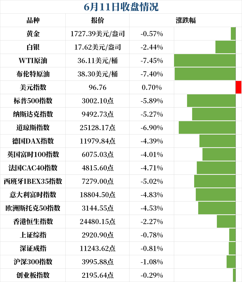 股市方面,投资者对第二波疫情爆发的担忧持续上升,市场不安情绪加深,美国三大股指均创下三月中旬以来最大单日跌幅。标普500指数跌5.89%;纳斯达克指数跌5.27%;道琼斯指数跌6.90%。