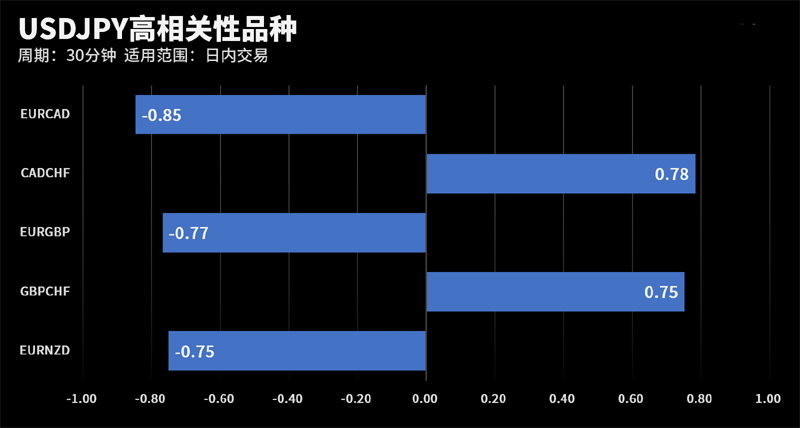 根据外汇相关性实时追踪,USDJPY在30分钟周期下与部分货币的相关性排行如下图: