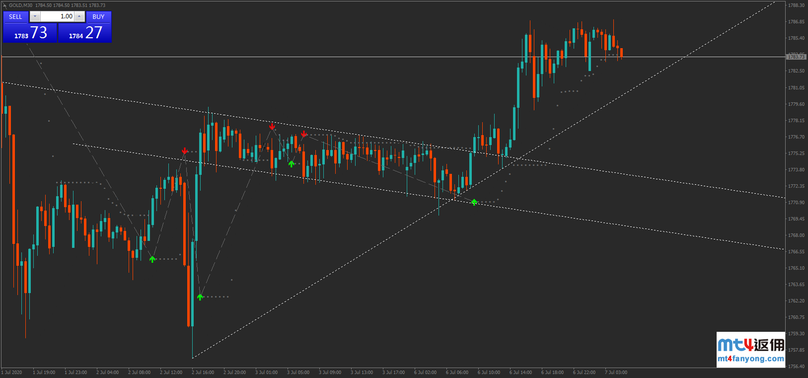 图为黄金30分钟走势,价格突破下降通道上轨后短线走高,正在接近前高1789附近阻力,若价格突破该阻力,则见斐波那契123.6%回调位1796.