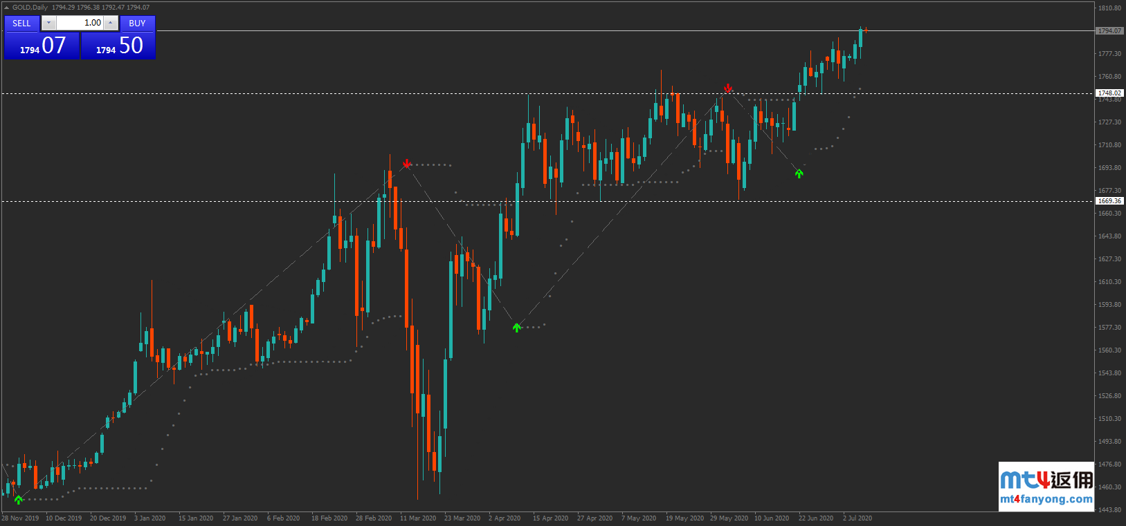 图为黄金日线走势,价格短线上行,正面临1800整数关口的关键阻力测试,若该阻力破位,则进一步阻力见斐波那契161.8%回调位1859附近。