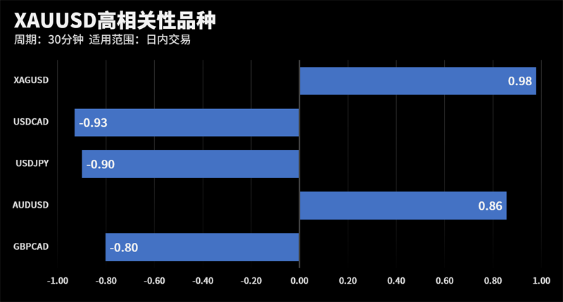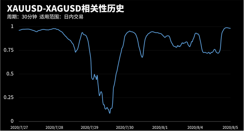 根据外汇相关性实时追踪,XAUUSD和XAGUSD在30分钟周期下相关系数达到0.98。
