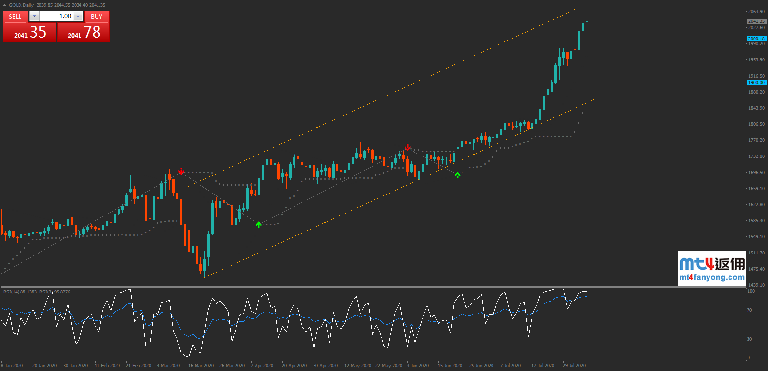 图为黄金日线走势,价格借助潜在的上升通道上涨,MACD指标显示价格上行压力依然较大,
