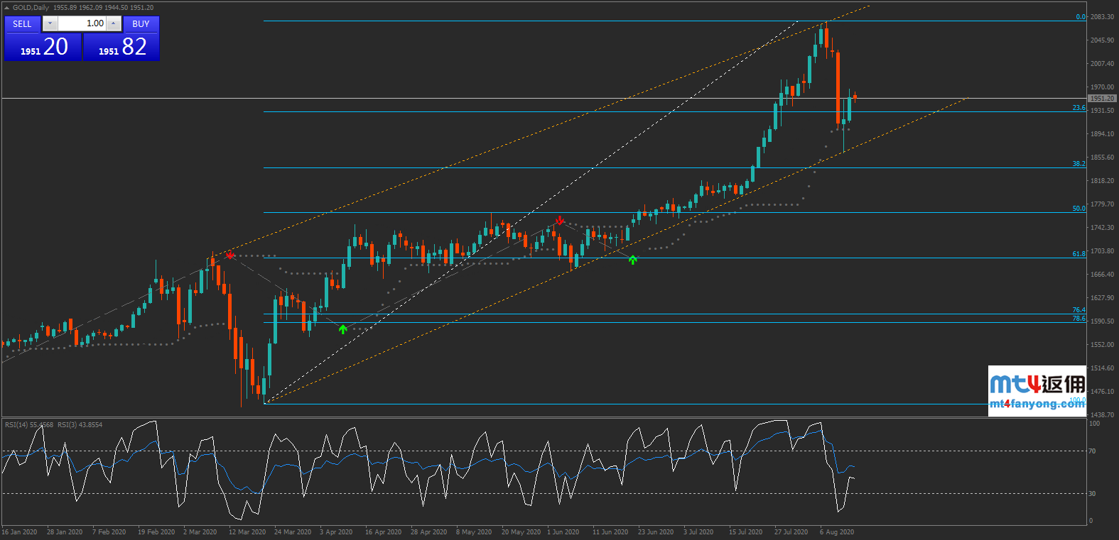 黄金日线走势,价格测试上升通道下轨支撑后反弹,已经突破斐波那契23.6%回调位1929水平,若价格进一步上涨,上方阻力见2000关口。