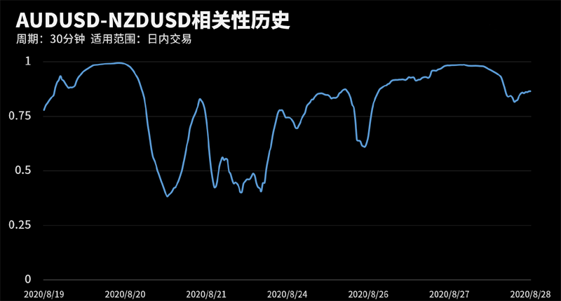 根据外汇相关性实时追踪,AUDUSD在30分钟周期下与部分货币的相关性排行如下图: