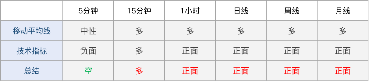 多周期技术信号显示日内市场情绪看涨:短线看涨(5分钟,15分钟,1小时),中线看涨(日线),长线看涨(周线,月线)。