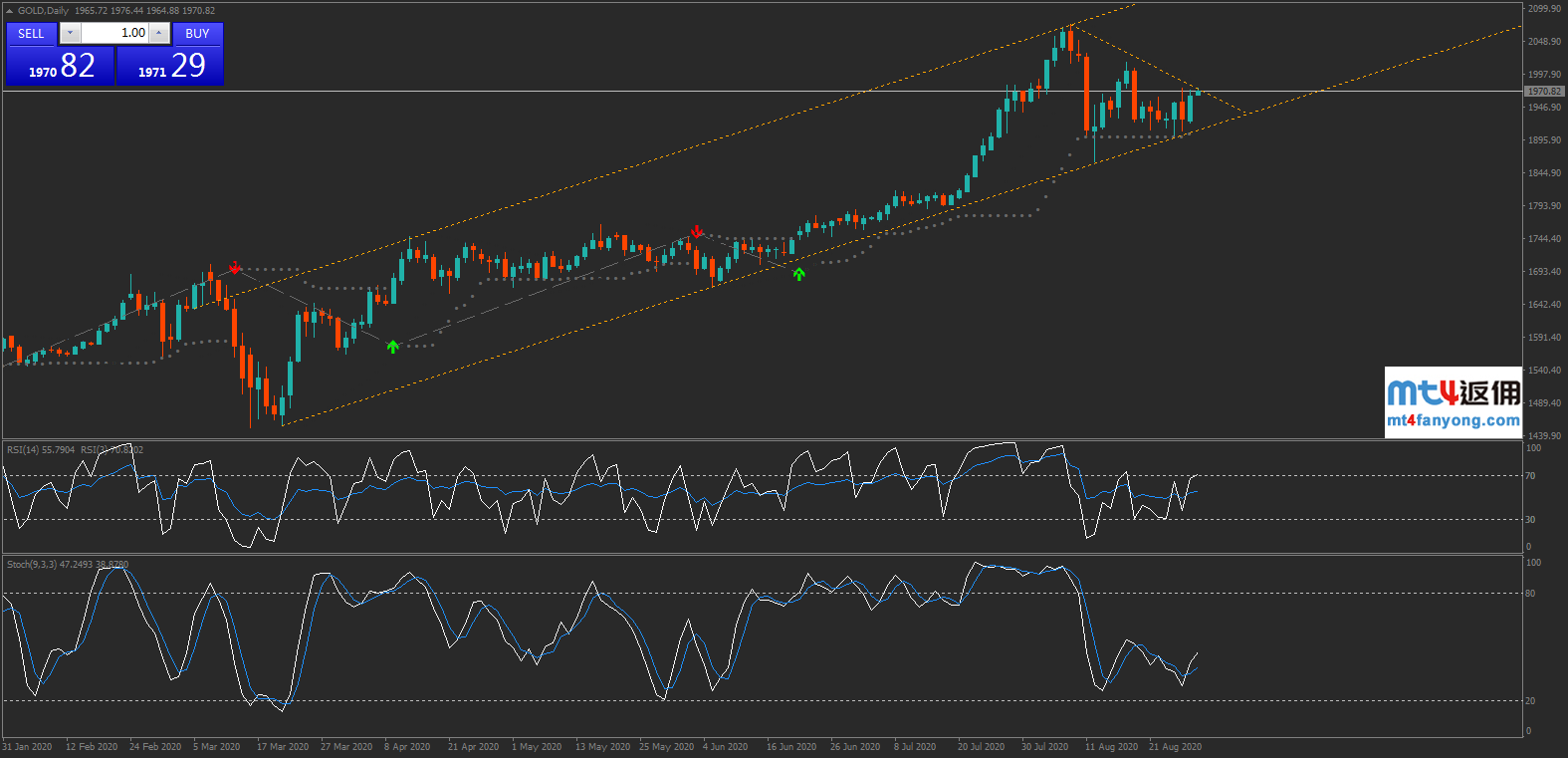 若金价受阻回落,下方较近支撑位见斐波那契50.0%回调位1959.18附近。