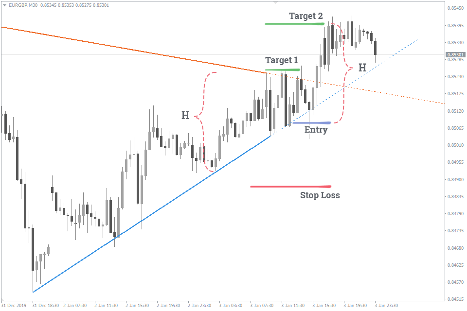 最终,所有的趋势线都会被突破。然后,所有交易者都不会错过这种情况的盈利机会。这个策略就是在趋势线被突破后,如何交易。