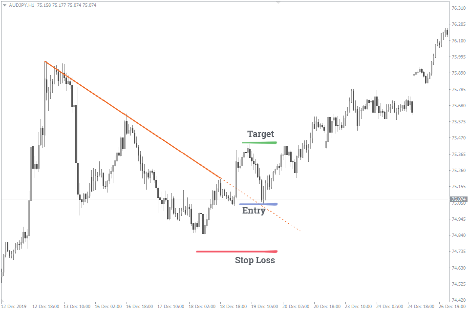 - 如果下降趋势线被突破,并且价格稳定在趋势线上方,如果价格后续从上方回调接触趋势线,交易者应该考虑入场做多。