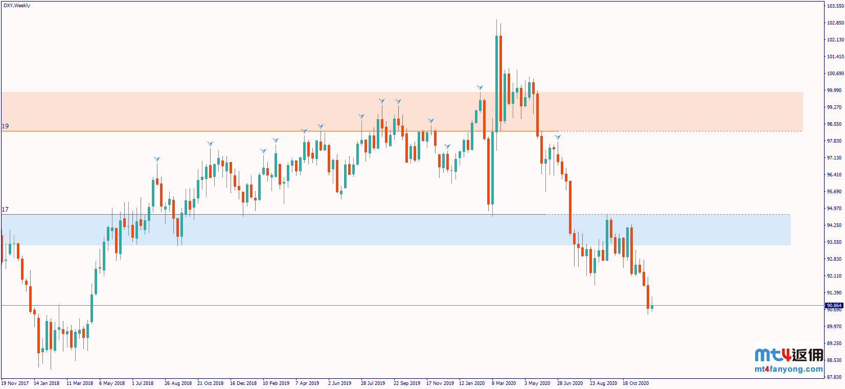 美元指数自9月高点以来已经暴跌超4%,上周甚至跌破了数年的上升趋势支撑线,暗示美元指数面临长期下跌风险。