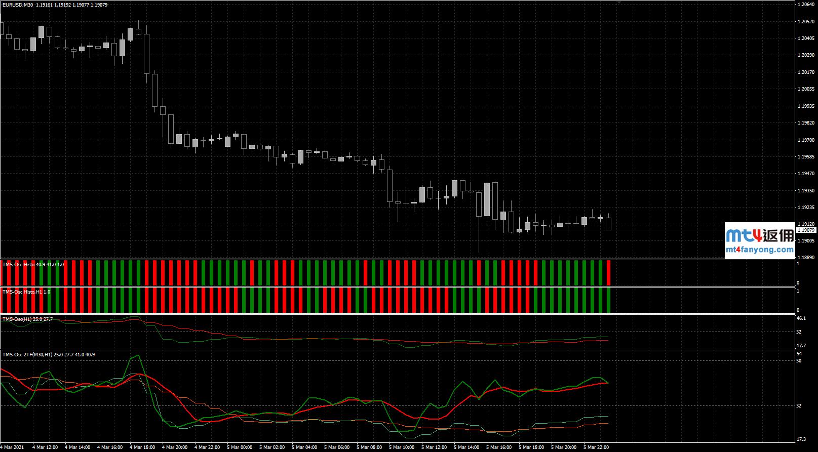 TMS Osc 2TF指标和TMS Osc是此交易系统的核心交易指标,而其他指标还可以帮助交易者找到趋势的方向以及对建仓最有利的位置。