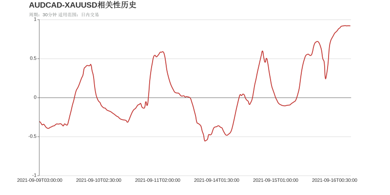 根据外汇相关性实时追踪,AUDCAD在30分钟周期下与部分货币的相关性排行如下图: