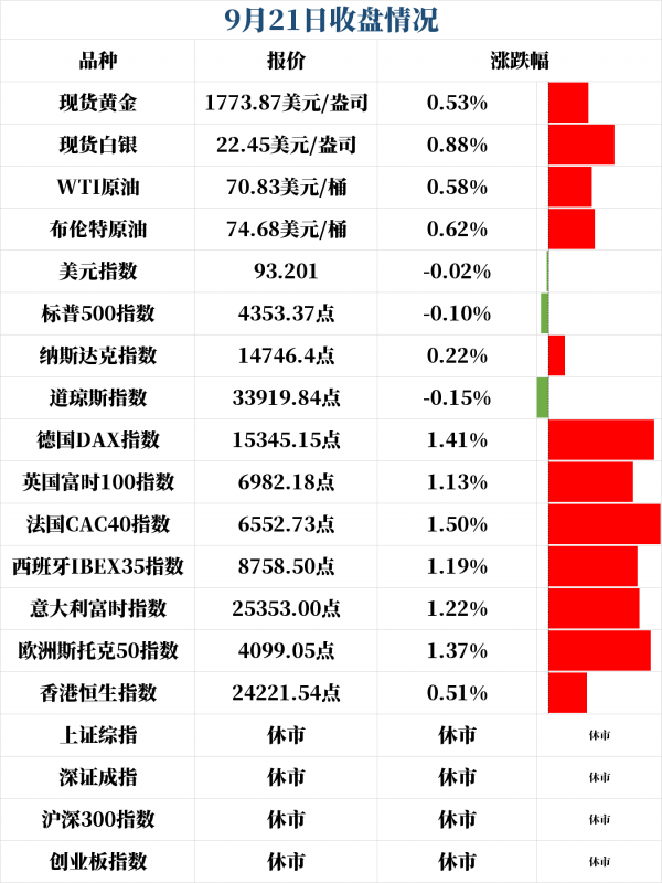 欧股主要股指全线翻红。欧洲斯托克50指数收涨1.37%,报4099.05点;德国DAX30指数收涨1.41%,报15345.15点;英国富时100指数收涨1.13%,报6982.18点;法国CAC40指数收涨1.50%,报6552.73点;西班牙IBEX35指数收涨1.19%,报8758.50点。