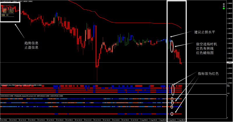 2. 做空时机:红色蜡烛图,且红色布林线(Boll);进场信号提示指标出现红色向下箭头和红色正方形;趋势强度指标皆为红色。