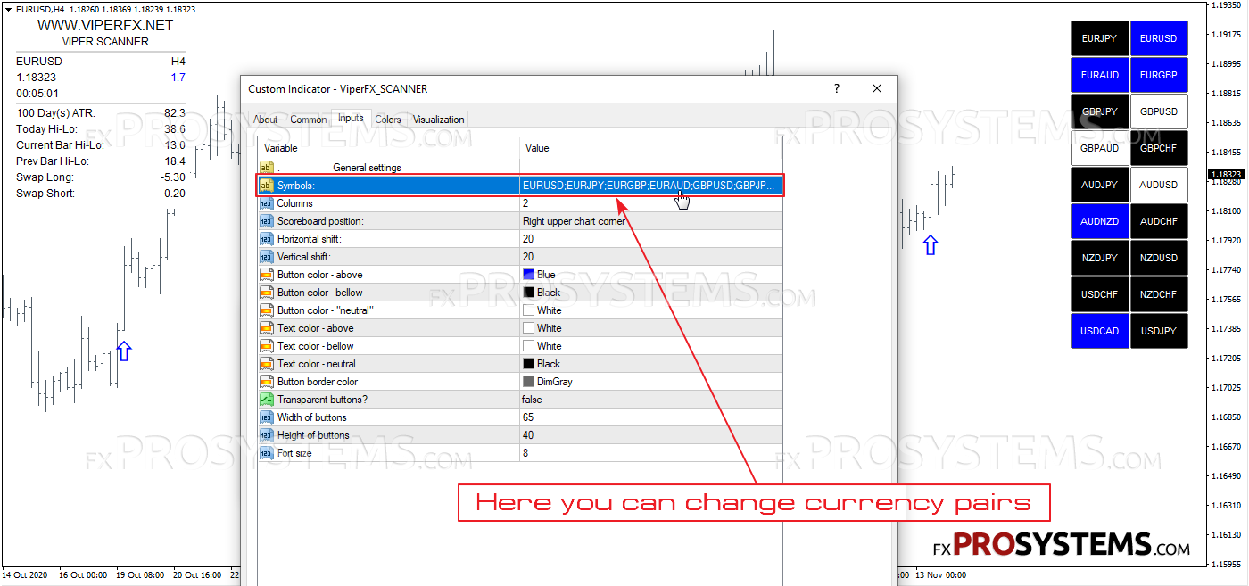 Forex Viper Scanner 系统可以跟踪您的 MT4 平台上可用的任何交易工具。要更改显示的货币对,只需进入扫描器设置(右键单击图表指标列表 ViperFXScannerinputs)。