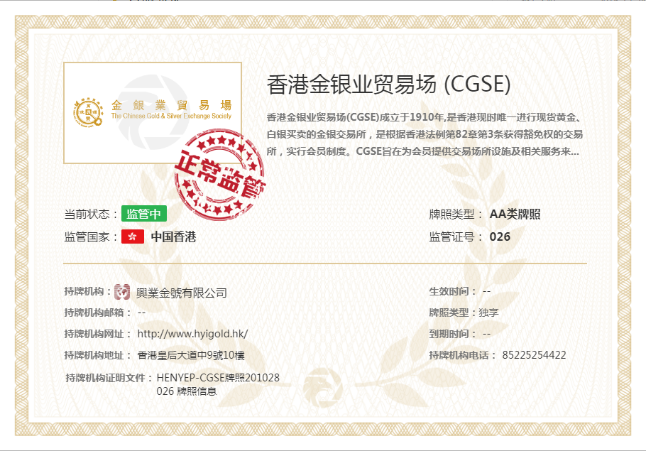 兴业金号有限公司是香港金银业交易场(CGSE)认可的电子交易成员(成员编号26号),持有AA类别市场交易有效营业执照,可经营伦敦金/银业务。研发最顶尖的技术、创造最一流的产品、提供最周到的服务,是兴业金号一直孜孜追求的行业目标