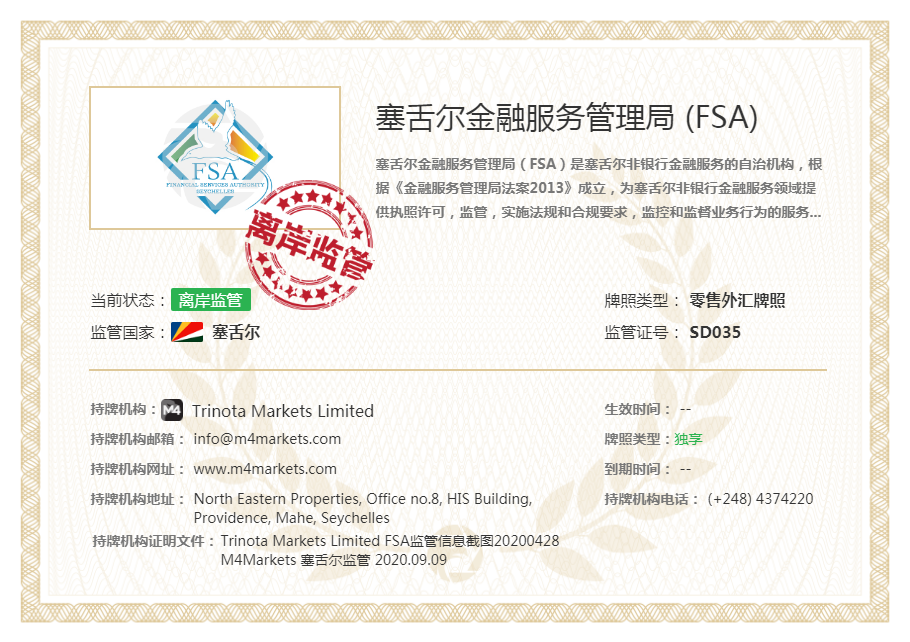M4Markets是Trinota Markets Limited的商号,公司是由塞舌尔金融服务管理局监管的证券交易商。M4Markets向客户提供全世界主要全球化市场的交易机会。M4Markets以一个简单的价值观为基础:客户为先。